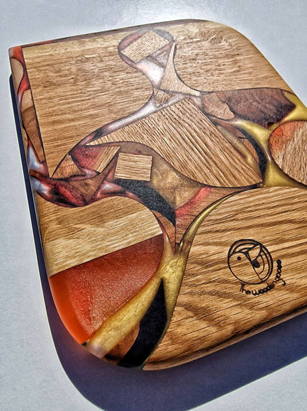 Platou realizat manual dintr-un mix de esente (stejar, cais, fag) si rasina epoxidica.