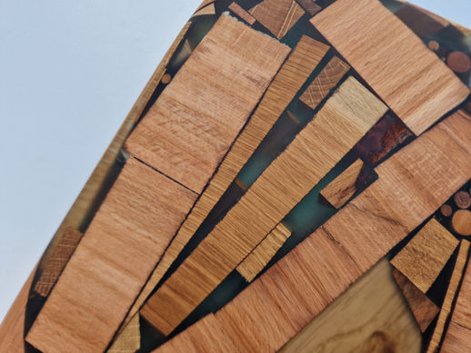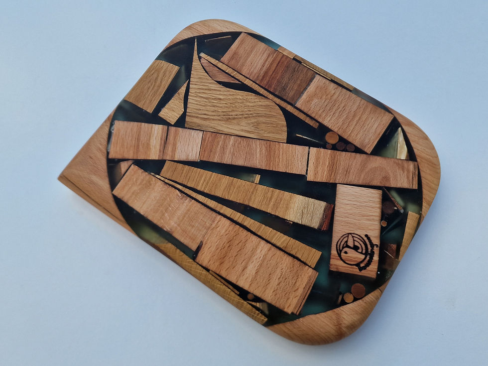 Platou realizat manual dintr-un mix de esente (stejar, fag) si rasina epoxidica.