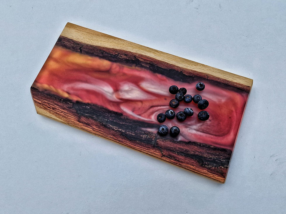 Platou realizat manual din lemn masiv de stejar si rasina epoxidica transparenta.