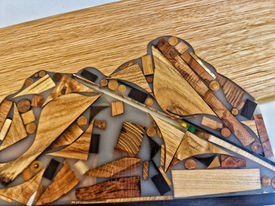 Platou realizat manual din mai multe esente de lemn masiv (stejar, fag, frasin, tei, salcam, nuc, molid, plop) si rasina epoxidica.