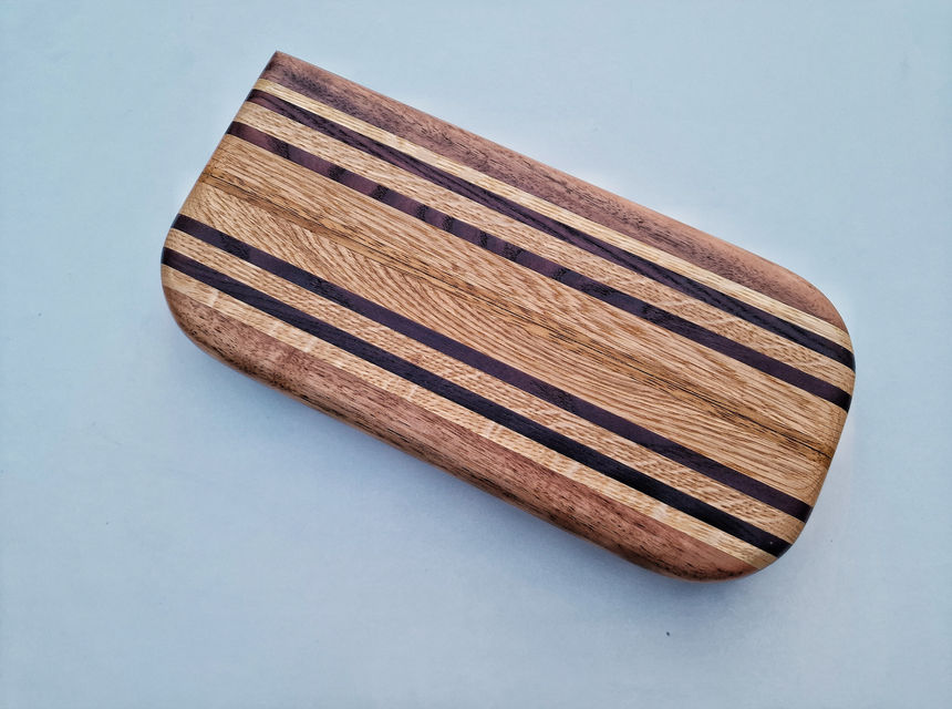 Platou/Tocator realizat manual din lemn masiv de nuc, iroko, frasin si stejar.