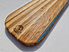 Platou realizat manual din lemn masiv de stejar cu insertii de rasina epoxidica.