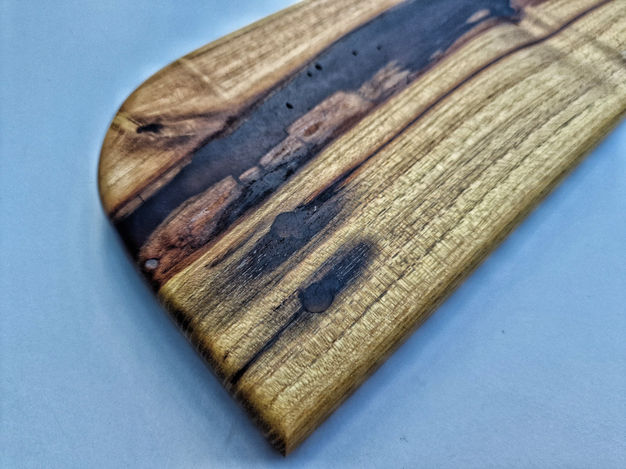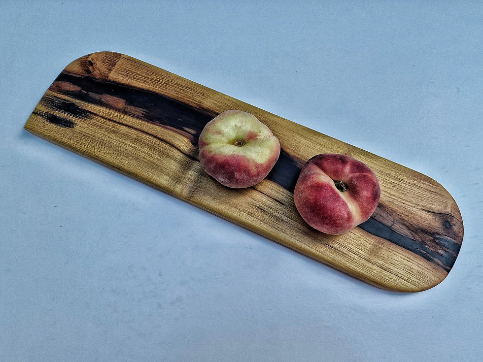 Platou/Tocator realizat manual din lemn masiv de salcam cu mici insertii de rasina epoxidica. Este realizat dintr-o singura bucata de lemn, păstrând astfel unicitatea si caracterul integral al lemnului.