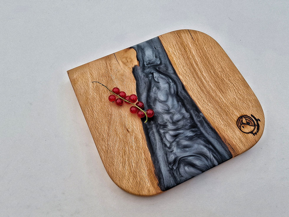 Platou realizat manual din lemn masiv de fag si rasina epoxidica. Este realizat dintr-o singura bucata de lemn taiata in doua, păstrând astfel unicitatea si caracterul integral al lemnului.