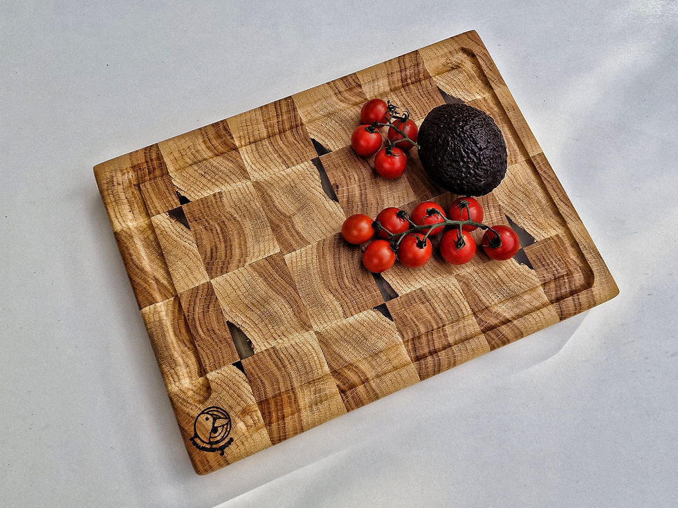 Platou/Tocator endgrain realizat manual din lemn masiv de stejar cu mici insertii de rasina epoxidica.